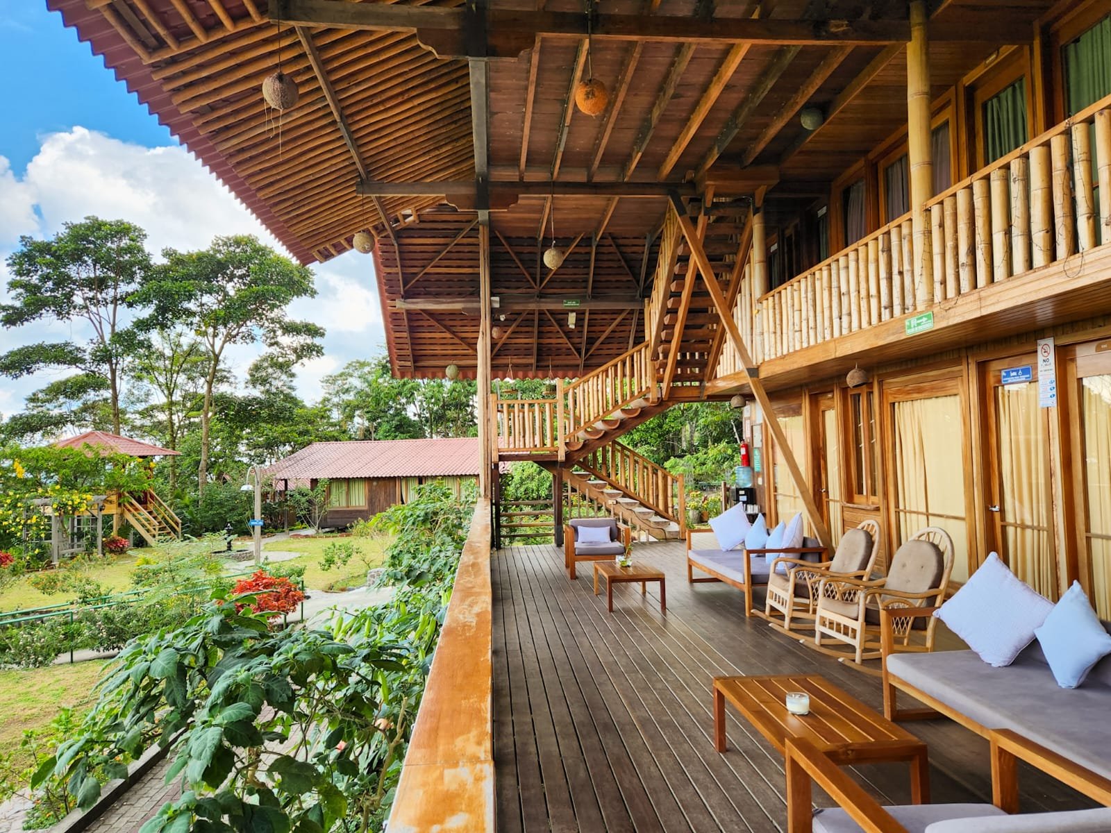 Tu santuario en la selva: Disfruta del descanso absoluto en una de nuestras 9 habitaciones o 4 suites independientes. Espacios diseñados para el confort, con espectaculares vistas panorámicas que integran la majestuosidad de la Amazonía ecuatoriana a tu habitación.